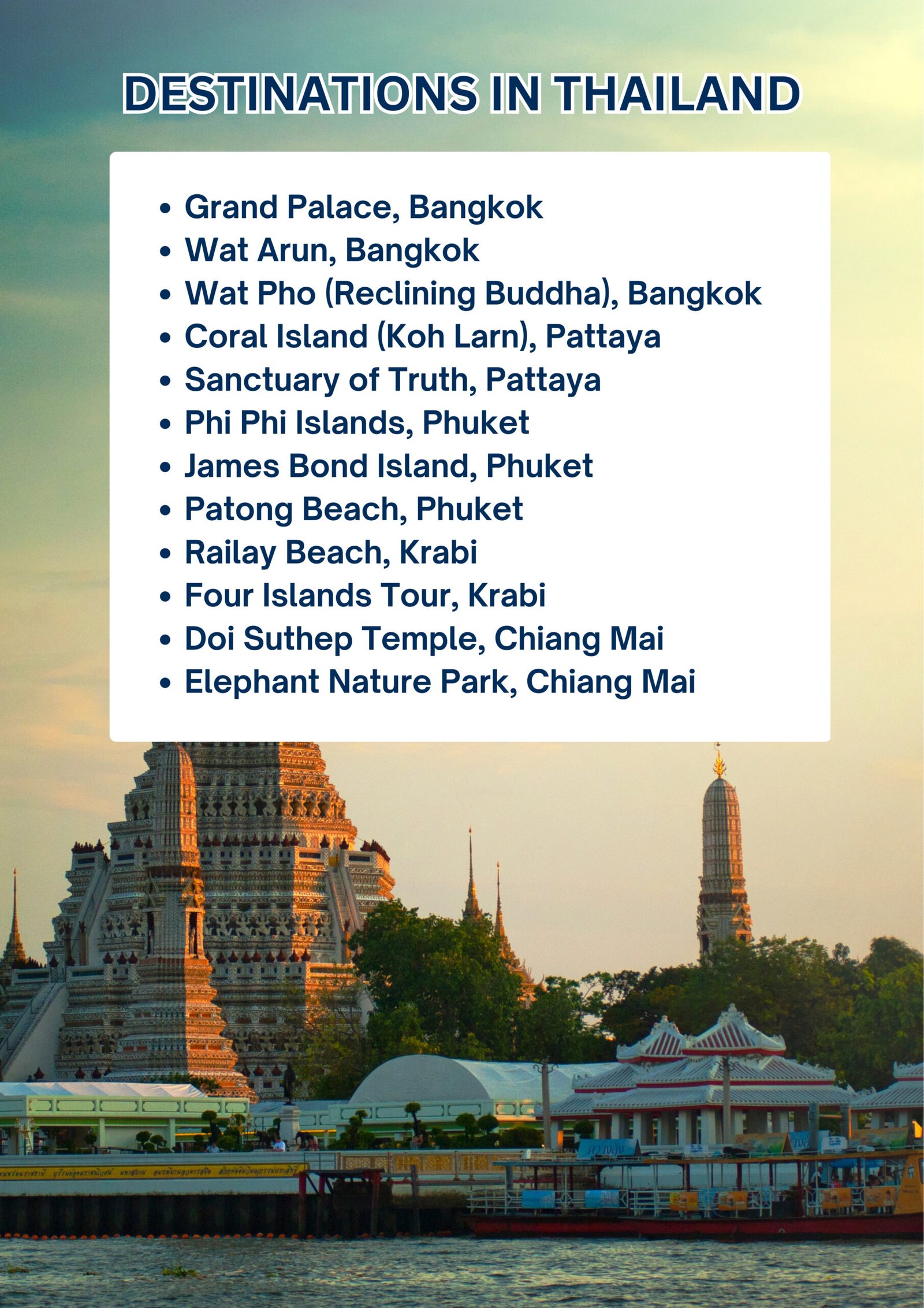- Phuket & Krabi: Island hopping, Phi Phi Islands, beach resorts.